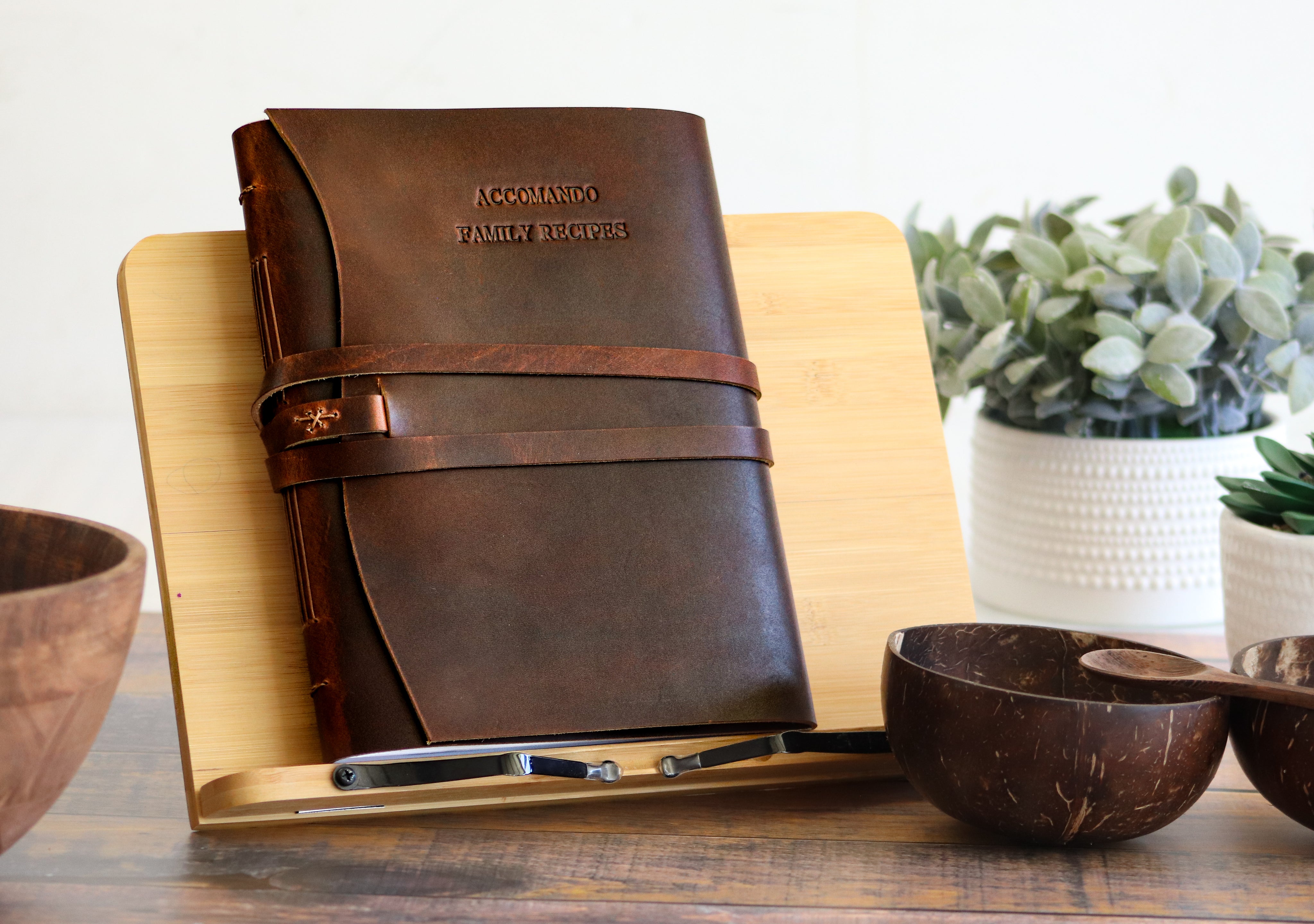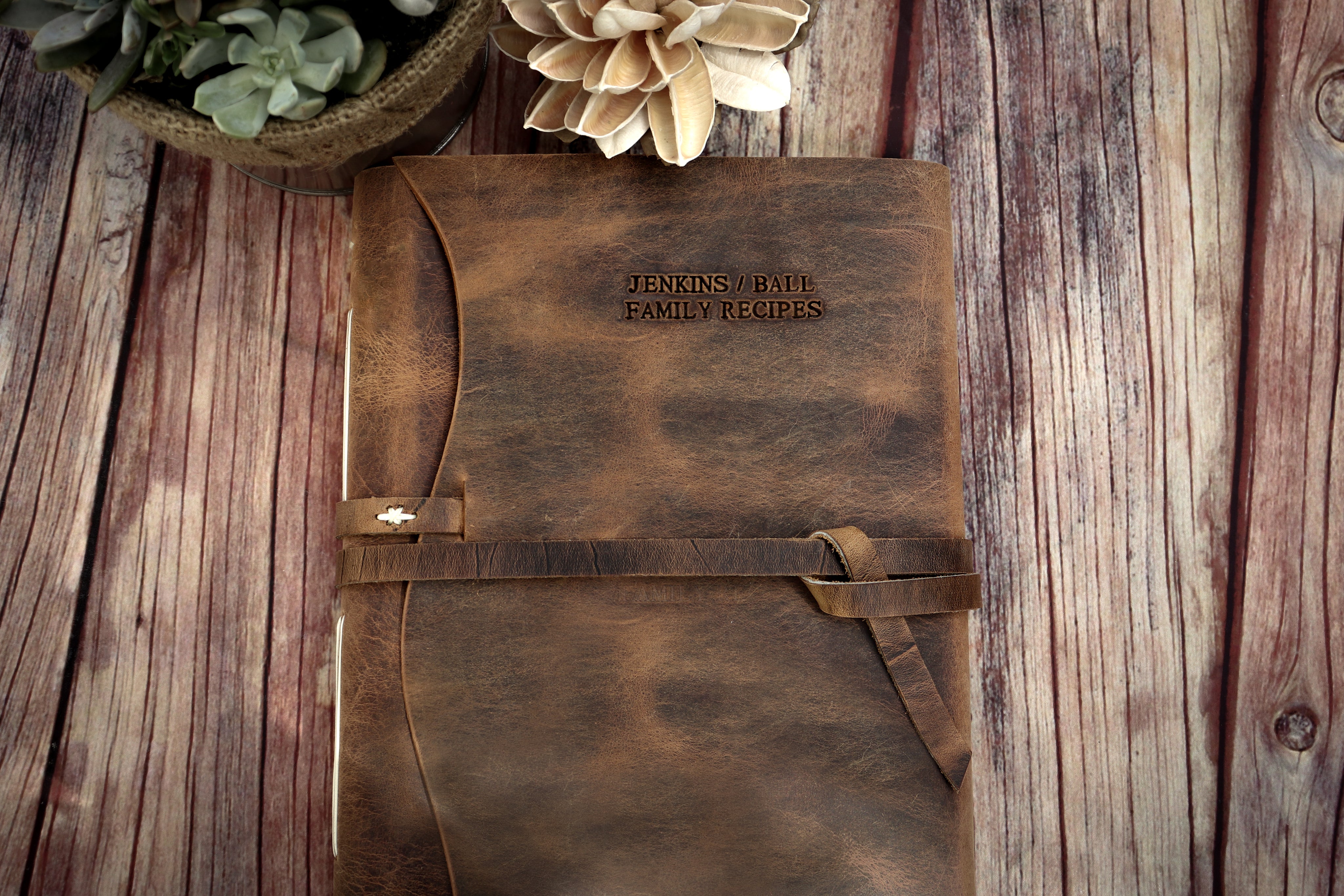 This handcrafted recipe journal features a full-length front fold-over flap, with a wrap-around leather strap enclosure.