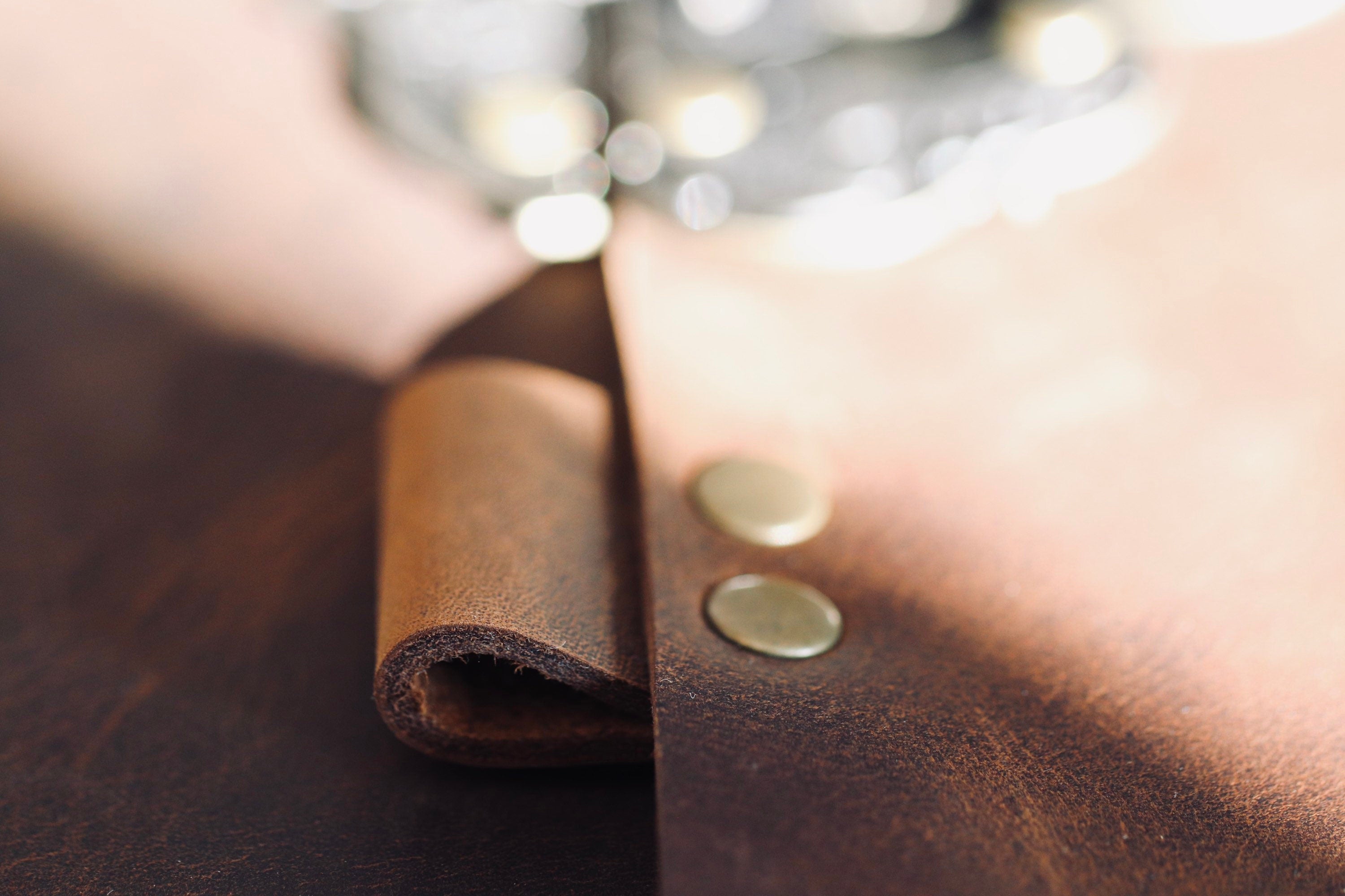 The pen loop is attached with brass rivets that will compliment the color of your leather. Depending on the specific design and details of your journal, there will be between 1-4 visible rivets.