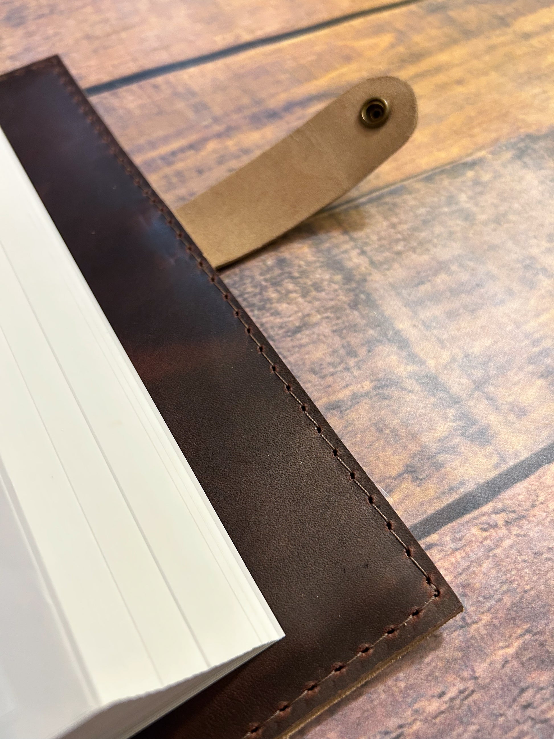 This cover is made with 2 inside leather pockets made to hold the hard front and back covers of the Bible into the pockets. Next, durable black elastic cords are secured to the spine to hold in sections of the Bible between the pages; and also to give a beautiful vintage aesthetic to the cover. The front cover enclosure is a brass button snap.