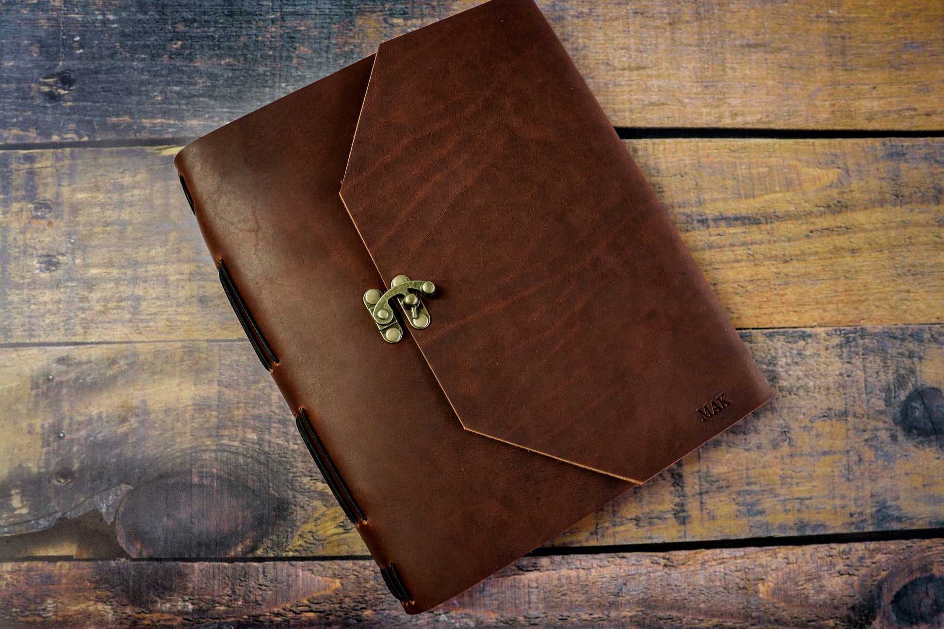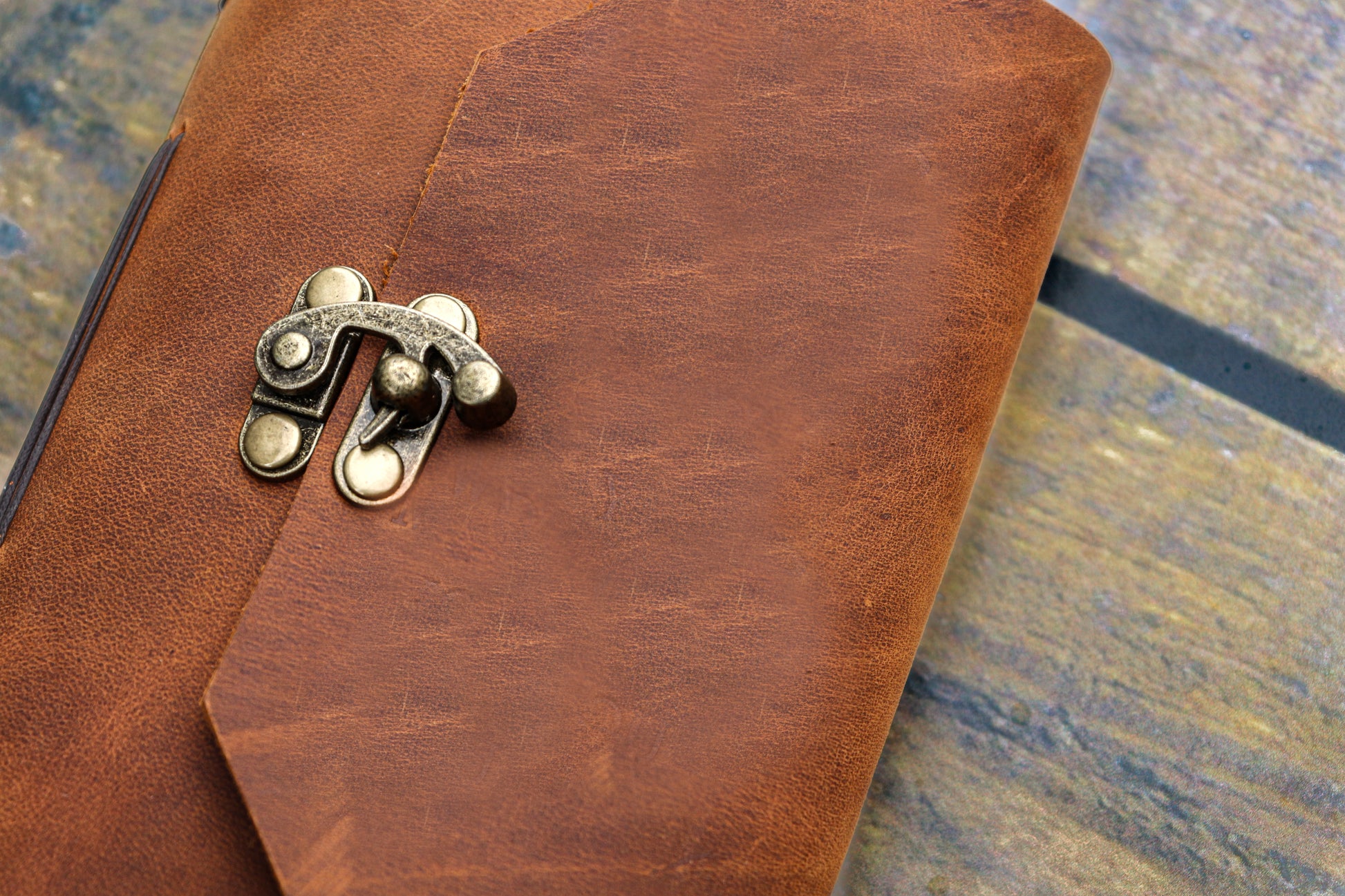 This handcrafted leather journal features a classic notebook style closure with a leather latch and strap enclosure. The outcome is functionality with a beautiful vintage feel. All of my books and journals are made to last a lifetime (at least!) And the leather only gets better with time.
