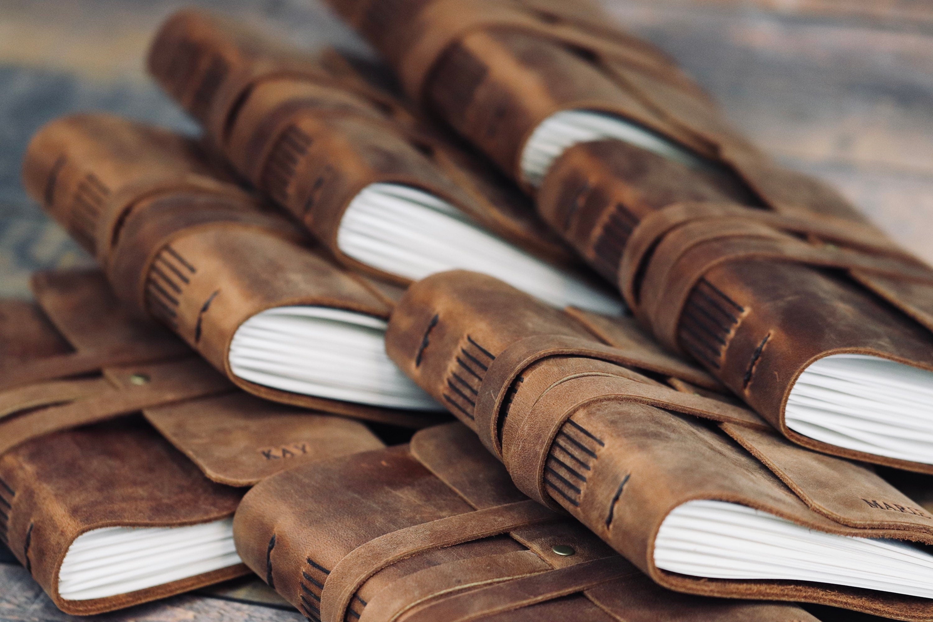 - This handcrafted leather journal features a wrap-around front cover and leather strap enclosure.
